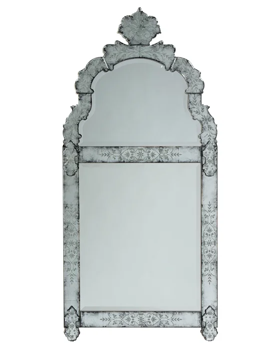 32"W X 68"H X 2"D Cartouche Mirror. Around the two modern bevelled edged mirrors there is an eglomise frame etched with flowers and leaves. The frame is also bevelled and has four additional applied mirror ornaments.